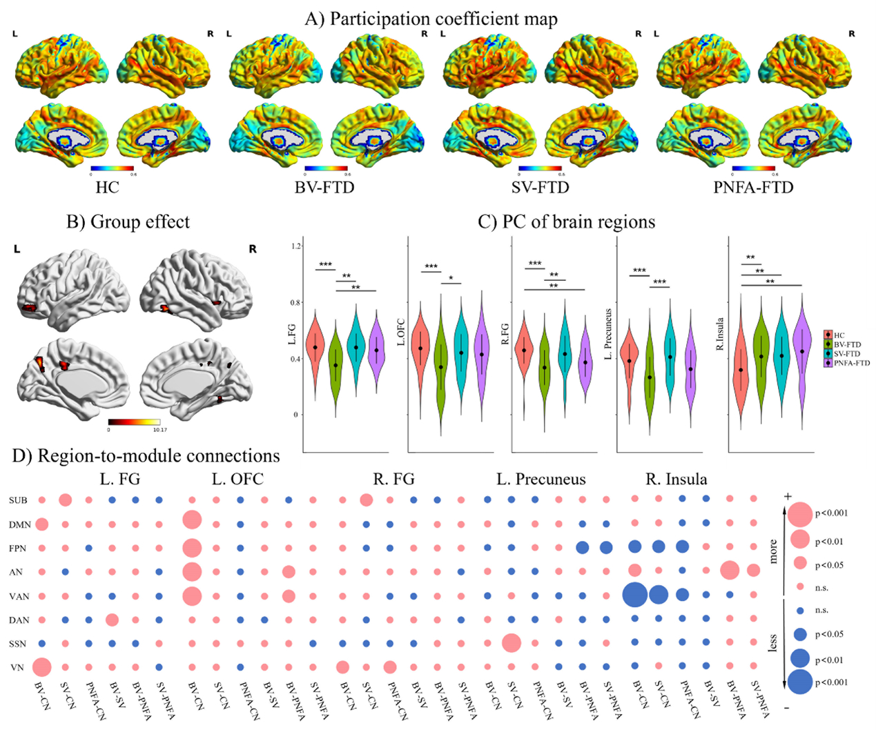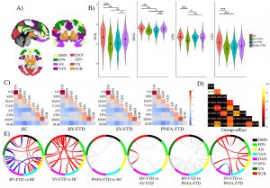 The results revealed that both bvFTD and svPPA groups exhibited decreased modular segregation index (MSI) in the subcortical module, default mode network, and ventral attention network, while patients with bvFTD displayed specific damage in the frontoparietal network, a system crucial for goal-directed behaviour and executive control. By contrast, patients with nfvPPA exhibited relatively preserved modular segregation, which is consistent with their more localised language impairment. It is also notable that network alterations in the insular and orbitofrontal cortex were strongly linked to patients’ emotional and behavioural abnormalities.