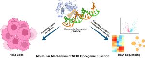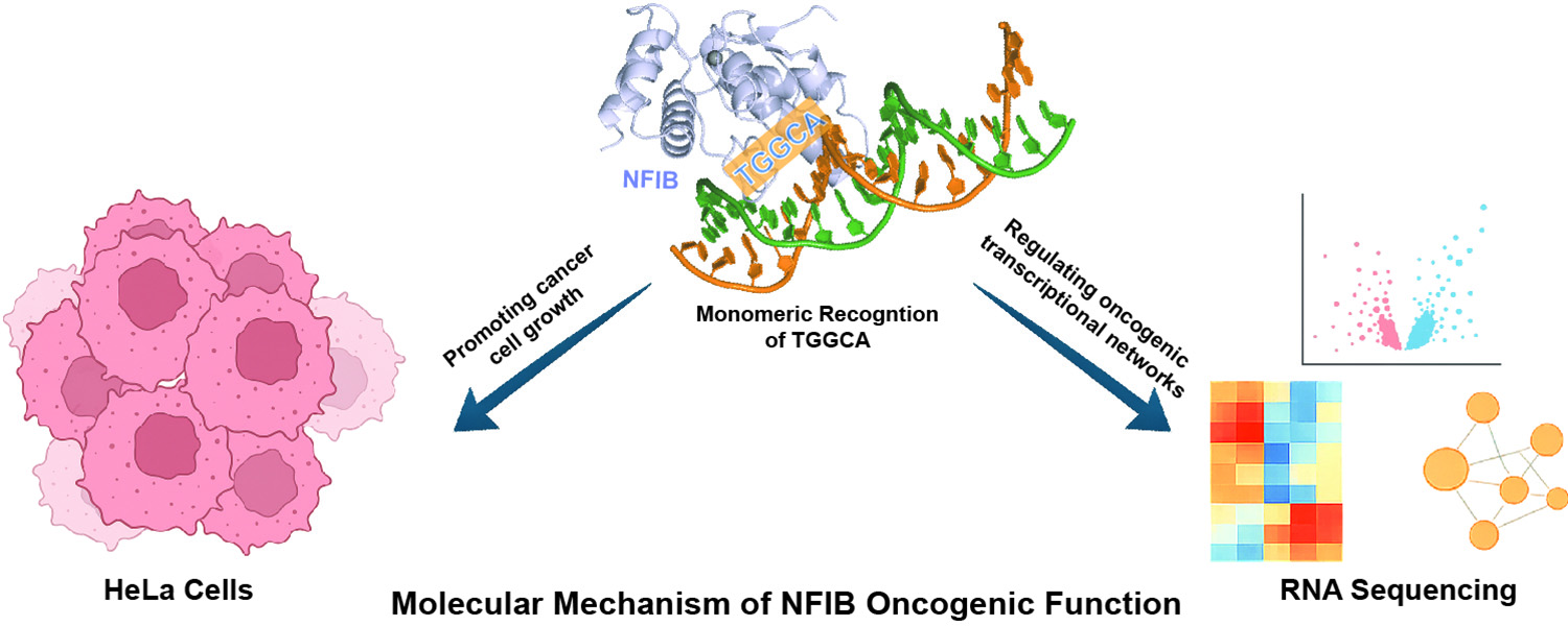 In the context of cancer transcriptional regulation, the team resolved an atomic-resolution structure of the NFIB–DNA complex and combined this with CRISPR knockout experiments and RNA-sequencing. The results show that NFIB promotes proliferation, migration, and invasion in HeLa cells and modulates the expression of multiple cancer-related genes. Structural analysis and mutational validation further indicate that NFIB’s DNA recognition relies on conserved base-specific contacts, informing the development of targeted anti-cancer strategies.