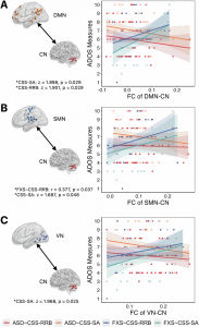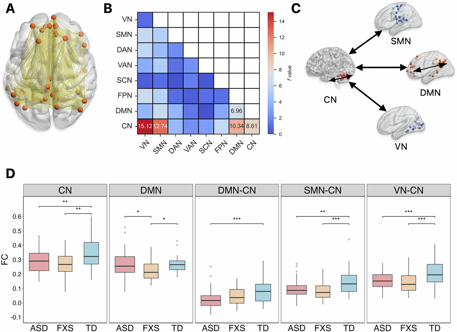 In the first study, the team used the resting-state functional MRI (fMRI) method to conduct advanced analyses of brain functional connectivity and network topology in 150 children, including 70 children with idiopathic ASD, 37 with FXS, and 43 typically developing (TD) controls. The study found a unique functional alteration in children with FXS (Figure 1). They exhibited significantly weaker intrinsic connectivity within the default mode network (DMN), which is crucial for self-referential cognition, memory, and emotional regulation. This impairment clearly distinguished FXS from both ASD and TD children. At the same time, both ASD and FXS groups showed weaker connections within the cerebellar network (CN), and weaker connections between the CN and other key networks, including the DMN, sensorimotor, and visual network, compared to TD controls. These findings suggest cerebellar dysfunction as a shared neural substrate underlying core behavioural phenotypes. The study also identified critical correlations between brain networks and core symptoms of ASD (Figure 2). The relationship between the severity of core symptoms (social affect and restricted repetitive behaviour) and connectivity between several networks differed for FXS versus ASD.