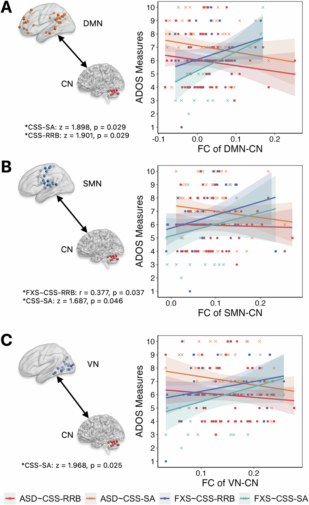Brain network functional connectivity is correlated with multi-domain cognitive-behavioural characteristics assessed by ADOS-2