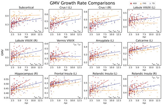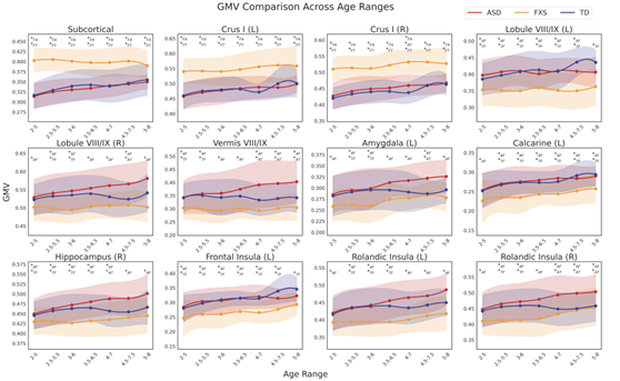 The second study focused on brain anatomy. The team used T1-weighted structural MRI data from 190 children, including 90 children with idiopathic ASD, 46 with FXS, and 54 TD controls to analyse grey matter volume (GMV) and its developmental trajectories. The findings revealed a pronounced and distinct neuroanatomical signature for FXS in early childhood (Figure 3). Compared with both idiopathic ASD and TD groups, children with FXS exhibited a complex pattern of regional volume alterations: significantly increased GMV in subcortical structures (most notably the caudate nucleus) and cerebellar Crus I, alongside substantial volume reductions in key cortical and cerebellar regions like the frontal insular regions and cerebellar vermis. This combination of overgrowth and undergrowth constitutes a clear structural ‘fingerprint’ for FXS. Importantly, these structural differences were dynamic and age-dependent (Figure 4). The GMV alterations in FXS remained consistent across narrow age ranges between two and eight years. The pivotal discovery was the significant divergence in GMV growth rates between the two disorders. Children with idiopathic ASD demonstrated a pattern of significantly accelerated GMV growth across the whole brain and nearly all regions of interest compared to both FXS and TD groups (Figure 5). In contrast, the FXS group showed growth trajectories either like TD children or significantly slower than the idiopathic ASD group in certain cerebellar regions. These results identify aberrantly accelerated brain growth as a key feature of idiopathic ASD in early childhood, distinguishing it from the developmental path of FXS.