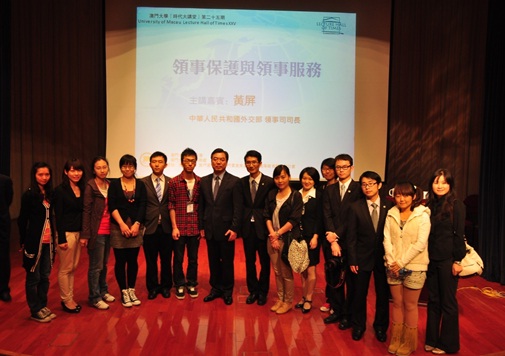 The University of Macau (UM) Lecture Hall of Times XXV, organized by UM’s Postgraduate Association, took place on 29 November at UM Library’s STDM Auditorium. Speaker Huang Ping, head of the Department of Consular Affairs of the Ministry of Foreign Affairs, People’s Republic of China, gave a talk on consular protection and consular services.