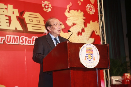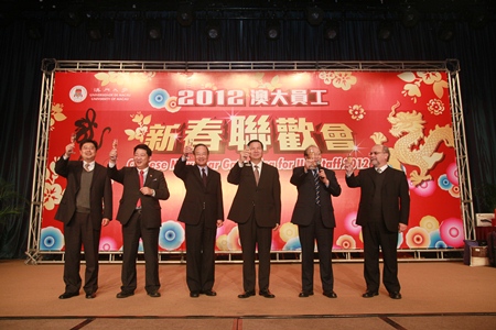 On 3 February 2012, Secretary for Social Affairs and Culture of Macao SAR Mr. Cheong U visited the University of Macau (UM), to stay abreast of UM’s latest developments. Mr. Cheong also attended UM’s Chinese New Year Gathering for Staff 2012 later in the evening. In his speech at the gathering, Mr. Cheong noted that in recent years UM has achieved pleasing results in numerous areas, and with the SAR government’s support UM has established a relatively sound teaching, research and governance system, and has produced a large number of outstanding graduates for society. He encouraged all UM members to make a united effort to help UM scale new heights in the future.