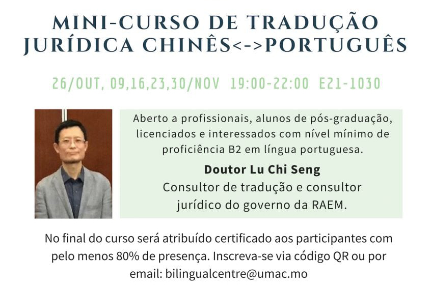 The workshop will be conducted in Portuguese on Friday evenings from 7:00pm to 10:00pm at the Faculty of Arts and Humanities (E21-1030). A minimum level of B2 Portuguese language proficiency, according to the Common European Framework of Reference for Languages (CEFR), is required to attend this course. For more information and application, please visit the webpage of the Department of Portuguese:https://fah.umac.mo/portuguese/fah-dport-portuguese-chinese-legal-translation-workshop-中葡法律翻譯工作坊/. The deadline for applications is 23 October.