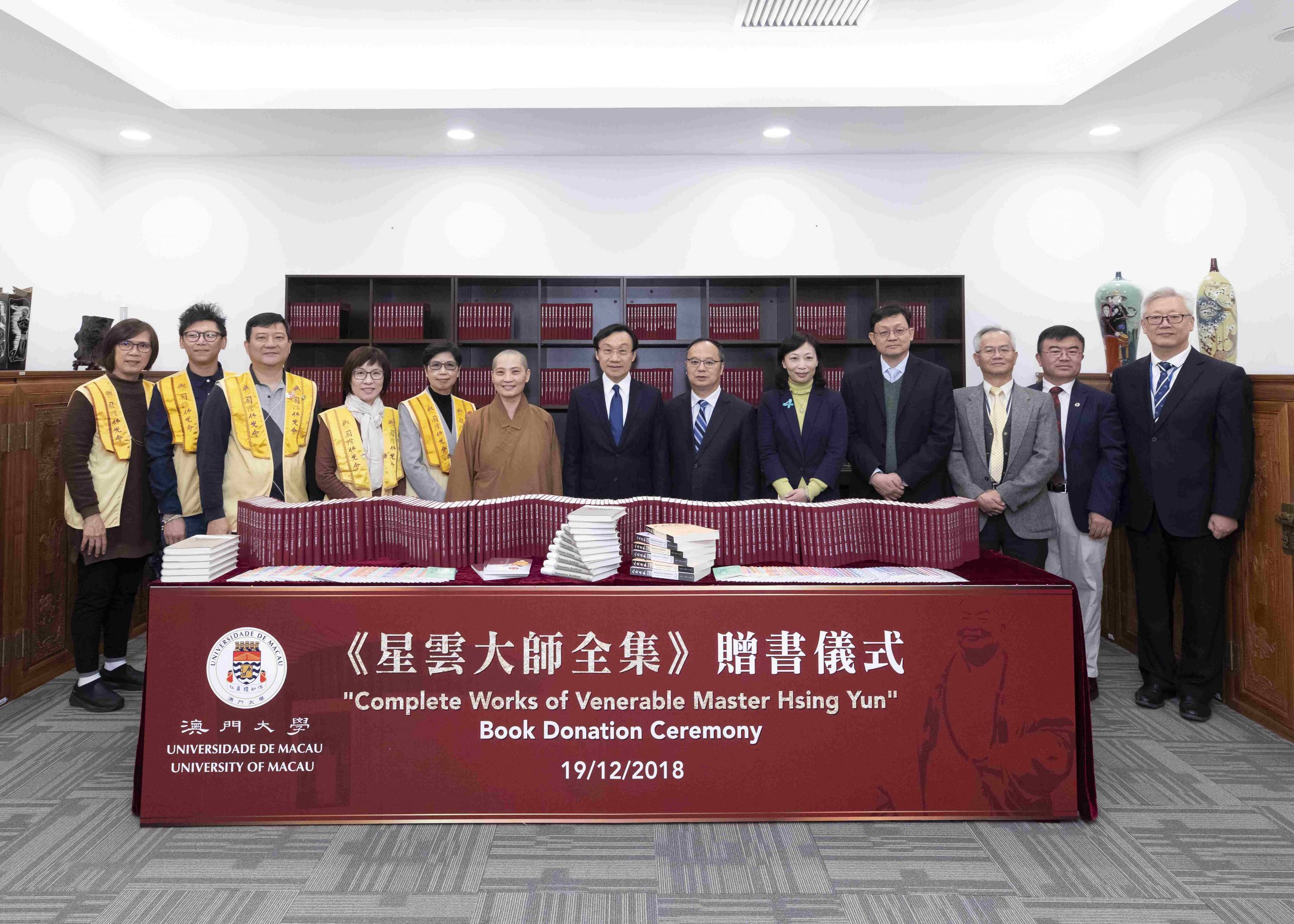 The Buddha’s Light International Association of Macau, on behalf of Master Hsing Yun, today (19 December) made a book donation to the University of Macau (UM). The books donated to UM include the Complete Works of Venerable Master Hsing Yun, the English version of a book on Buddhism titled Humanistic Buddhism: Holding True to the Original Intents of Buddha, a Buddhist journal, and a book collection titled 100 Humanistic Buddhism’s Paths to Happiness. The book donation ceremony was held in the UM Wu Yee Sun Library. Guests attending the ceremony included Tam Chon Weng, secretary for social affairs and culture; Mok Ian Ian, director of the Cultural Affairs Bureau; the president of the Buddha’s Light International Association of Macau; Lou Pak Sang, director of the Education and Youth Affairs Bureau; Yonghua Song, rector of UM; Wu Jianzhong, librarian of UM; and Jacky So, dean of the Faculty of Business Administration.