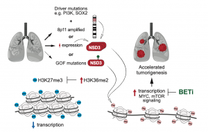 In this study, the researchers found that the H3K36 methyltransferase, NSD3, is also located in this region of chromosome 8. Using mice as the model organism, the knockdown of NSD3 slowed tumour growth and prolonged survival in mice. The researchers also identified a genetic variant in NSD3, which is common in patients with this type of tumour, increasing the catalytic activity of H3K36 dimethylation both in vitro and in vivo. This variant accelerated tumourigenesis and decreased overall survival in the mouse model. This variant induced the landscape change in the epigenetics and promoted oncogenic gene expression programming. This study also revealed that NSD3-dependent tumours might be sensitive to bromodomain inhibitors with potential clinical value.