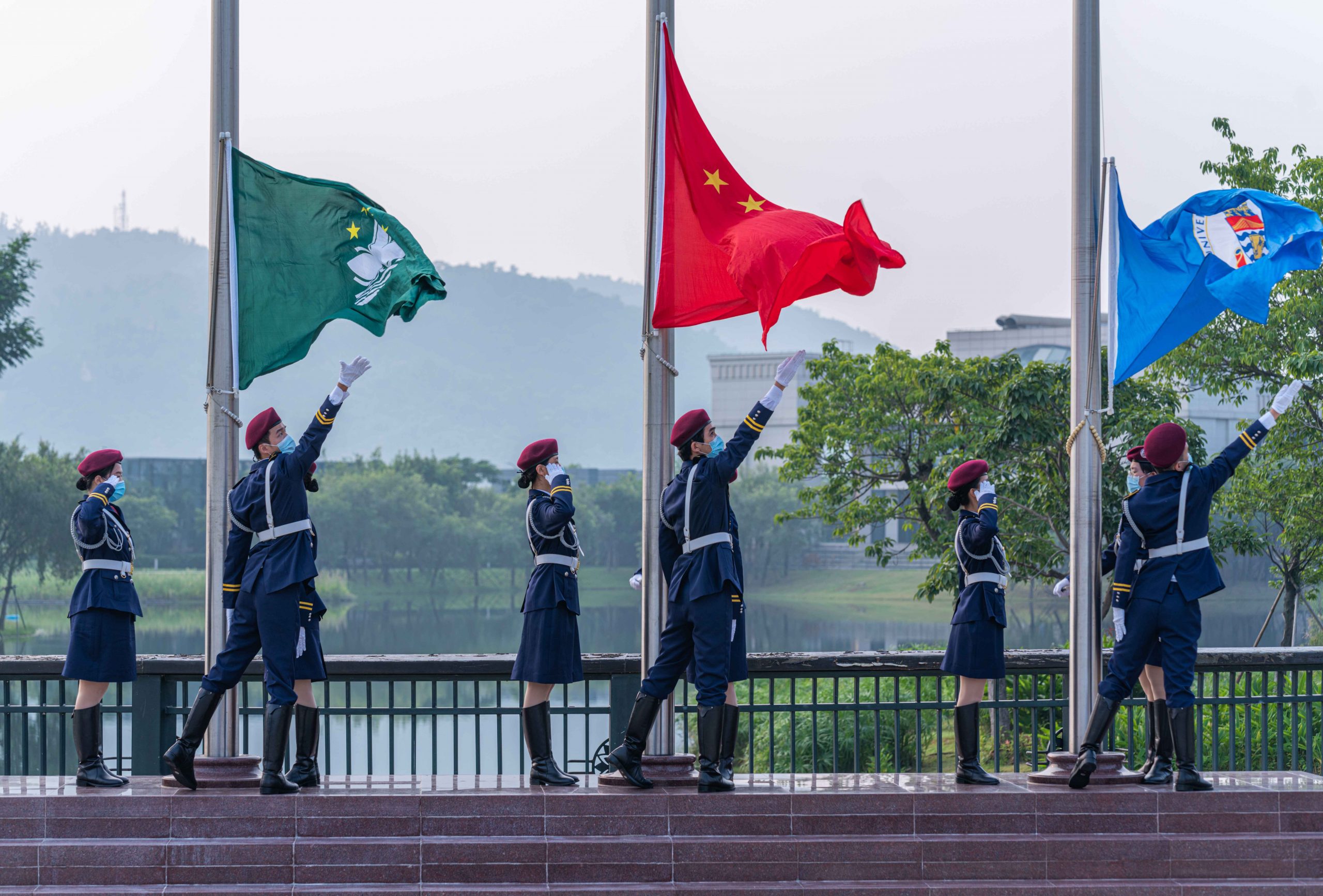 The University of Macau (UM) National Flag Team today (1 October) held a flag raising ceremony in the university’s Lotus Square, to celebrate the 72nd anniversary of the founding of the People’s Republic of China. In response to the epidemic prevention requirements of the Macao SAR government, faculty and students were not invited to attend the ceremony; the National Flag Team members, spectators, and staff were required to present their green health codes and have their body temperature checked before entering the venue. They were also required to wear a mask and keep a safe distance from each other throughout the ceremony.