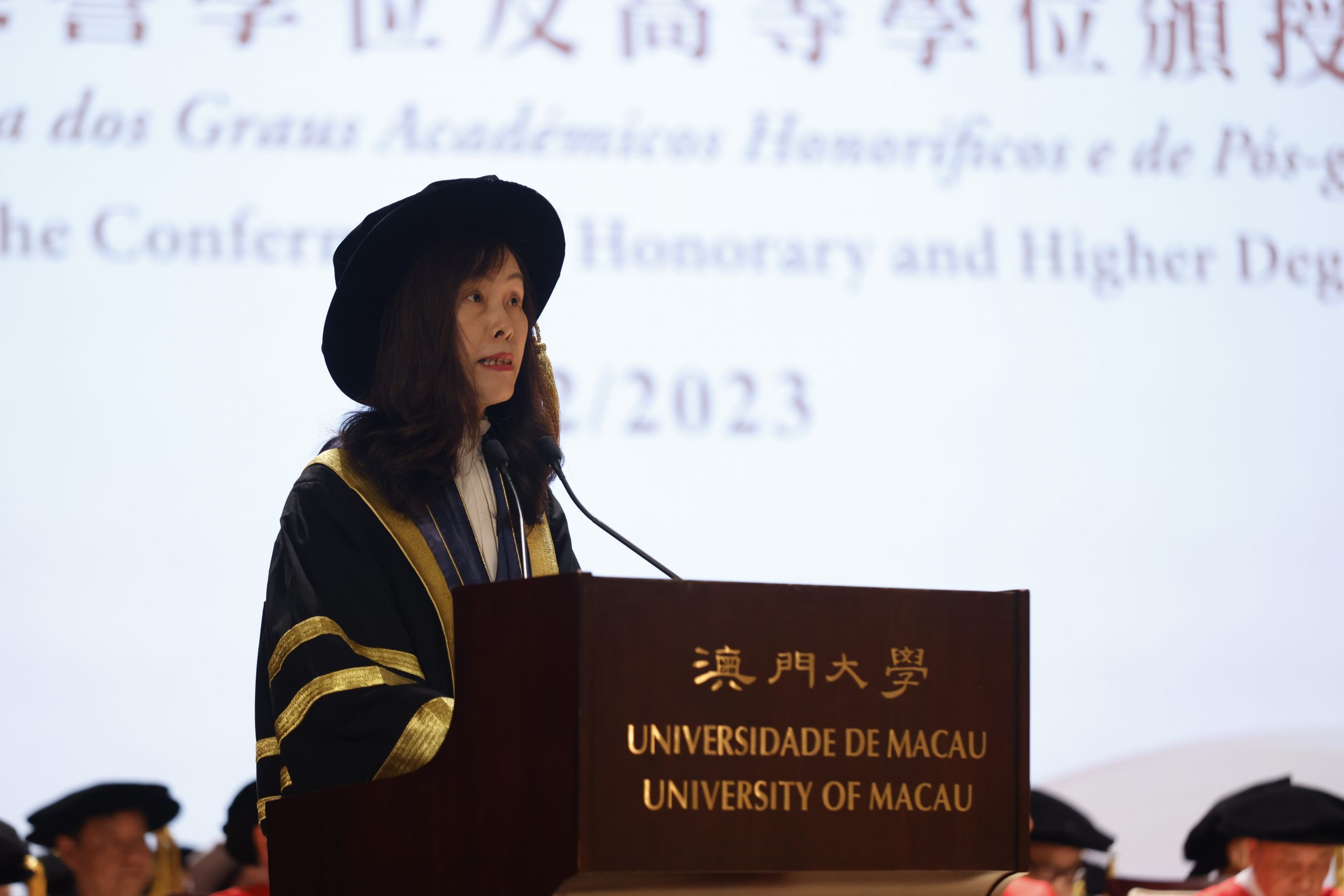 In her speech, Secretary Ao Ieong said that UM has actively implemented the higher education policies of the Macao SAR Government. The university has continuously improved the quality of its faculty, teaching, and research, and achieved significant results in expanding regional and international cooperation, fostering research innovation, and promoting industry-academia collaboration. As a result, UM’s international reputation has been growing steadily. It is worth noting that UM has made an impressive debut in the Times Higher Education World University Rankings 2024, securing the 193rd position and placing it among the top 200 universities worldwide. The Macao SAR Government will support local public institutions, including UM, to explore favourable development opportunities in the Guangdong-Macao In-depth Cooperation Zone in Hengqin, and further support higher education to replenish the talent pool for the development of key industries in Macao. She also encouraged the graduates to demonstrate their love and commitment to the country and Macao, and put into practice UM’s motto ‘humanity, integrity, propriety, wisdom, and sincerity’, so as to contribute their wisdom and strength to the robustness of the ‘One Country, Two Systems’ policy, the great rejuvenation of the Chinese nation, and the advancement of human civilisation.