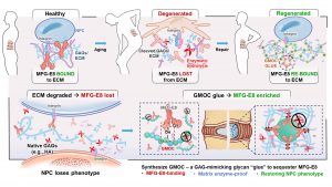 As people grow older, degeneration of the intervertebral discs can lead to common symptoms such as chronic lower back pain and reduced mobility in the lower limbs, significantly diminishing quality of life. However, current clinical treatments either only provide temporary pain relief or carry a risk of recurrence following surgery. Through the detailed analysis of clinical specimens and databases, the research team made a groundbreaking discovery: the progression of IDD is linked to the loss of a protein called MFG-E8, which is crucial for maintaining the health of nucleus pulposus cells. Further investigation revealed that this protein depletion is caused by an increase in glycosidases in the nucleus pulposus tissue of the disc. These enzymes act like scissors, cleaving the glycosaminoglycans (GAGs) that normally protect MFG-E8. Building on this finding, the team synthesised a glucomannan octanoate (GMOC), a compound with a structure similar to human GAGs, which can shield MFG-E8 from degradation and resist destruction by glycosidases.