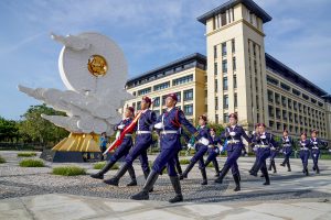 In celebration of the 76th anniversary of the founding of the People’s Republic of China, the National Flag Team of the University of Macau (UM) held a flag-raising ceremony at UM Lotus Square today (1 October). Members of the National Flag Team escorted the national flag of the People’s Republic of China, the regional flag of the Macao SAR, and the UM flag, and marched to the flagpole near ‘The Wall of Great Wisdom’. As the national anthem played, the three flags were raised. Around 500 UM members attended the ceremony, including Vice Rector Mok Kai Meng, Dean of Students Paul Pang, as well as college masters and members of residential colleges.
