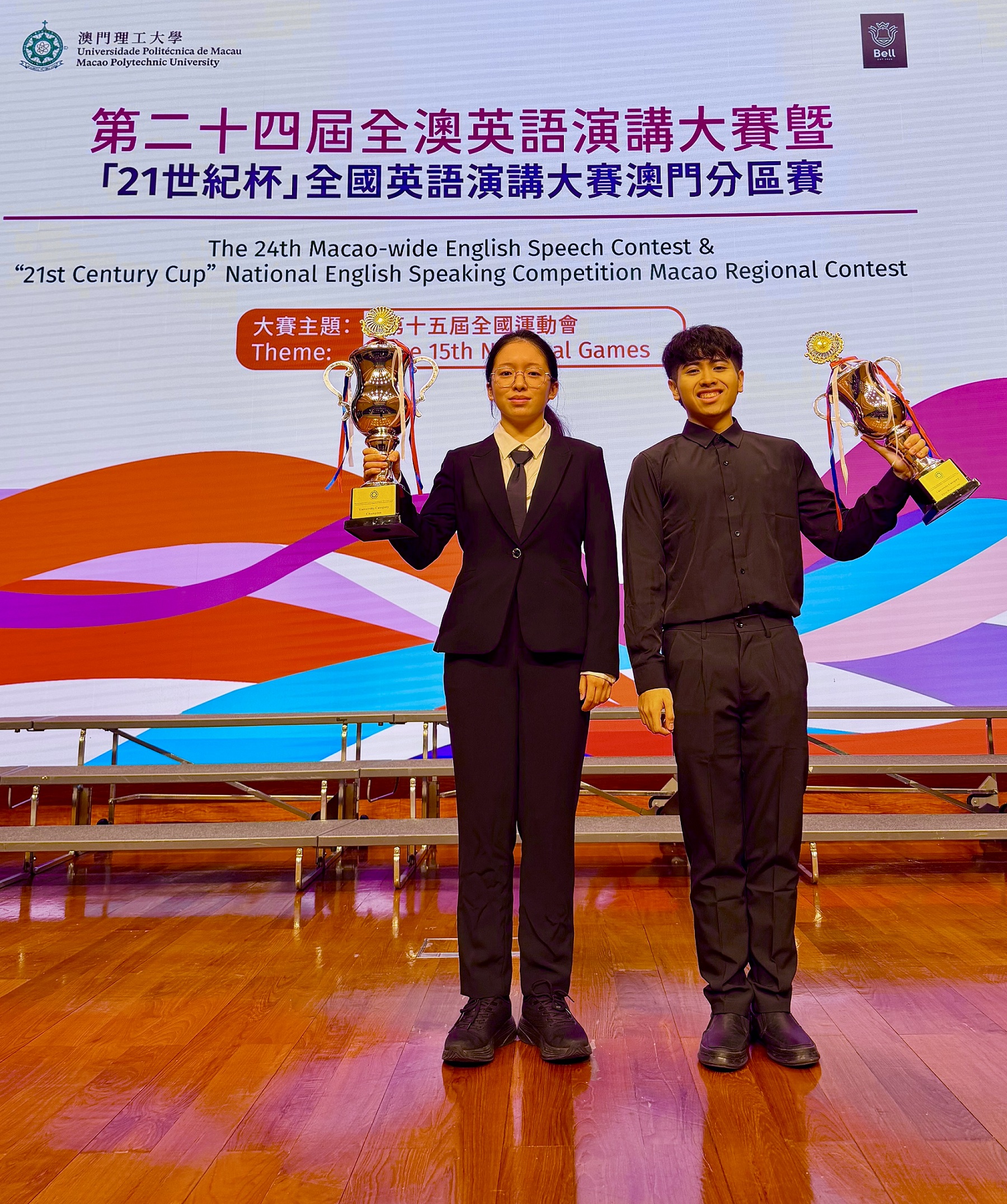 The University of Macau (UM) English Public Speaking Team delivered an impressive performance at the 24th Macao-wide English Speech Contest & the ‘21st Century Cup’ National English Speaking Competition Macao Regional Contest, securing both the championship and first runner-up titles in the university category.