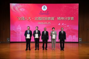 The University of Macau (UM) held a sharing session on the first session of the 14th National People’s Congress (NPC) and the first session of the 14th Chinese People’s Political Consultative Conference (CPPCC) National Committee (‘two sessions’) on 25 March. Titled ‘Learning about the “Two Sessions” 2026’, the sharing session aimed to explore the significance of the ‘two sessions’ and their key takeaways, and to enable students and faculty members to learn about the country’s political, economic, and societal development. Guest speakers at the event included Ho Kevin King Lun and Chan Hong, Macao SAR deputies to the 14th NPC, as well as Mok Chi Wai, a member of the 14th CPPCC National Committee.