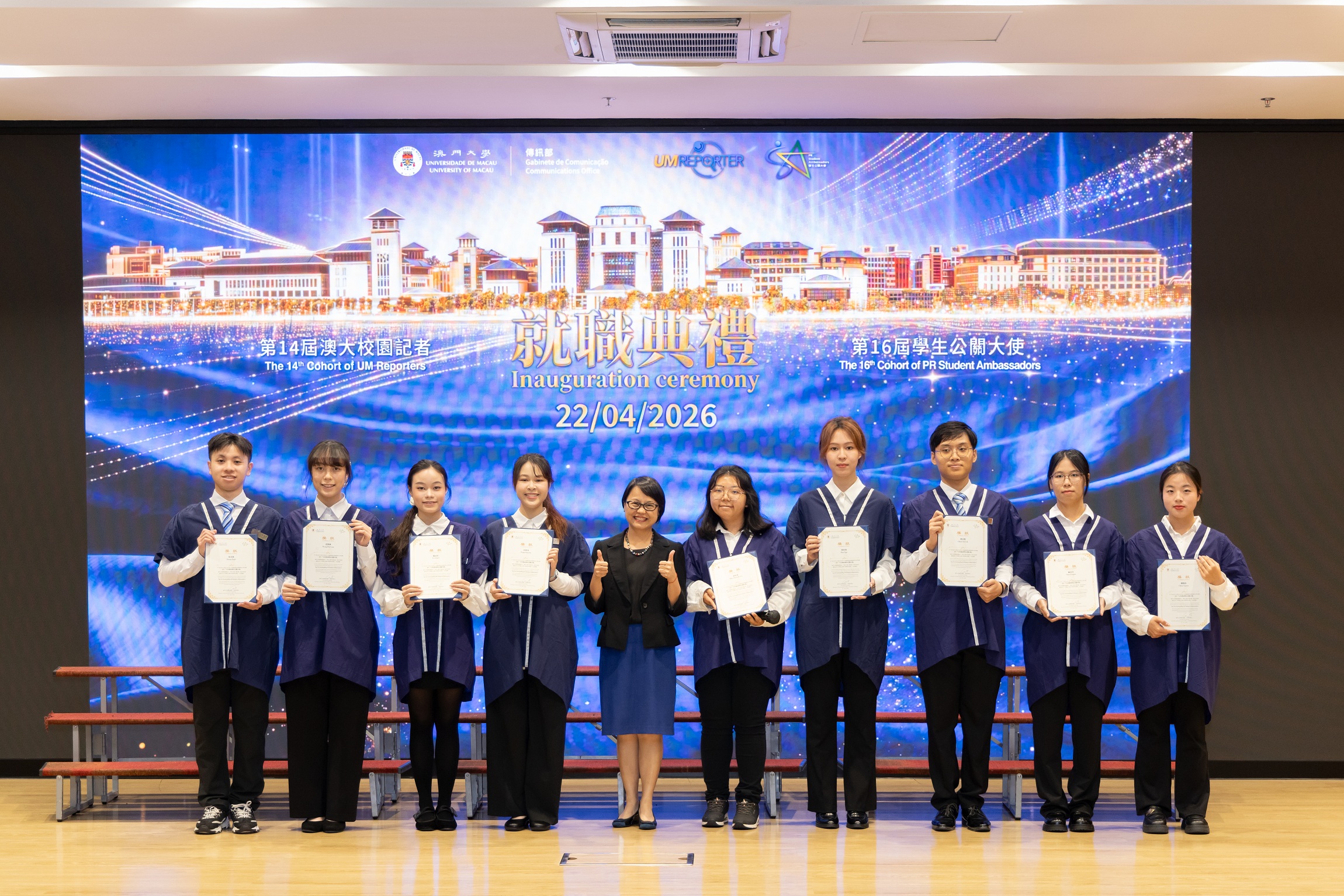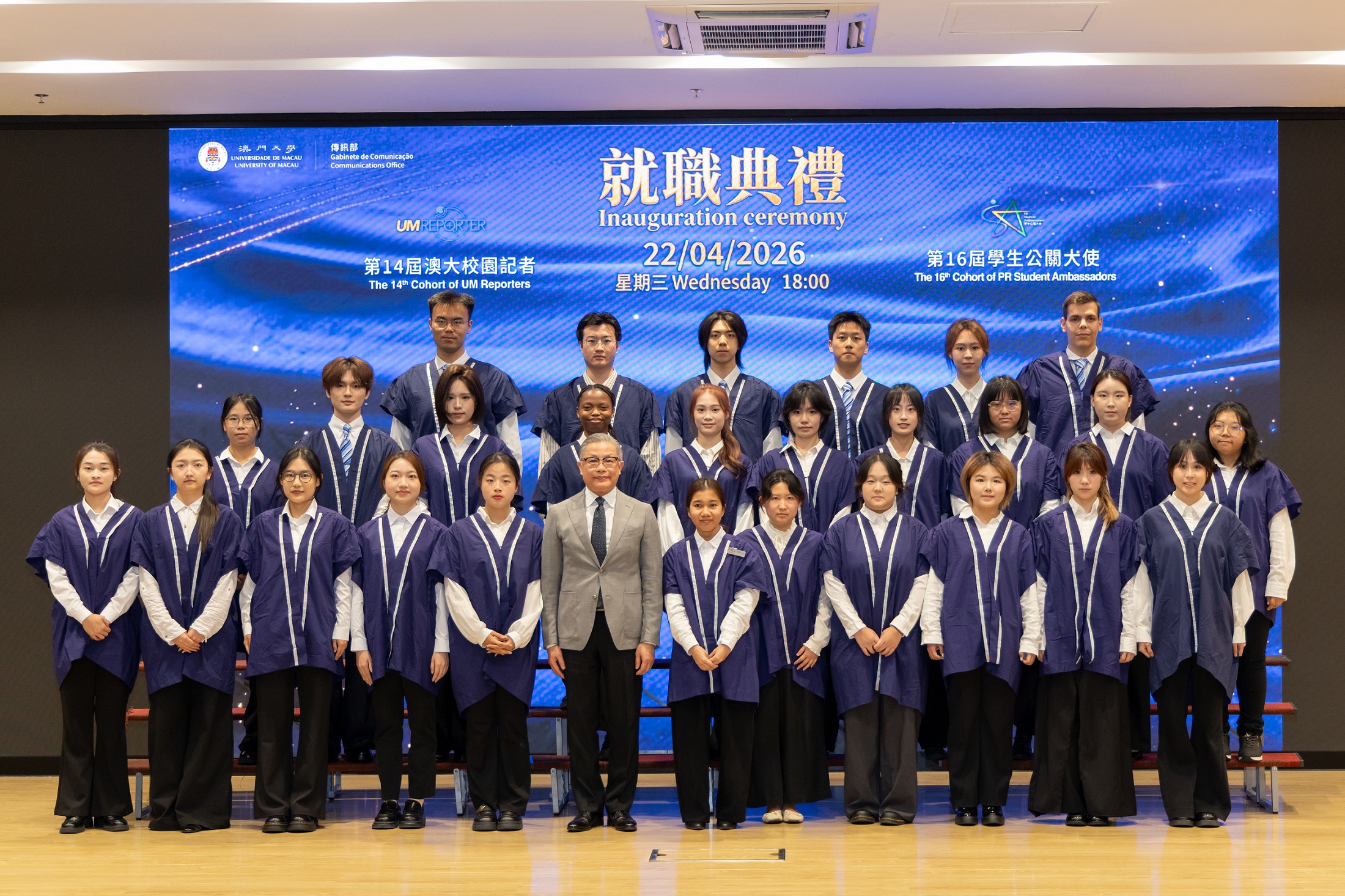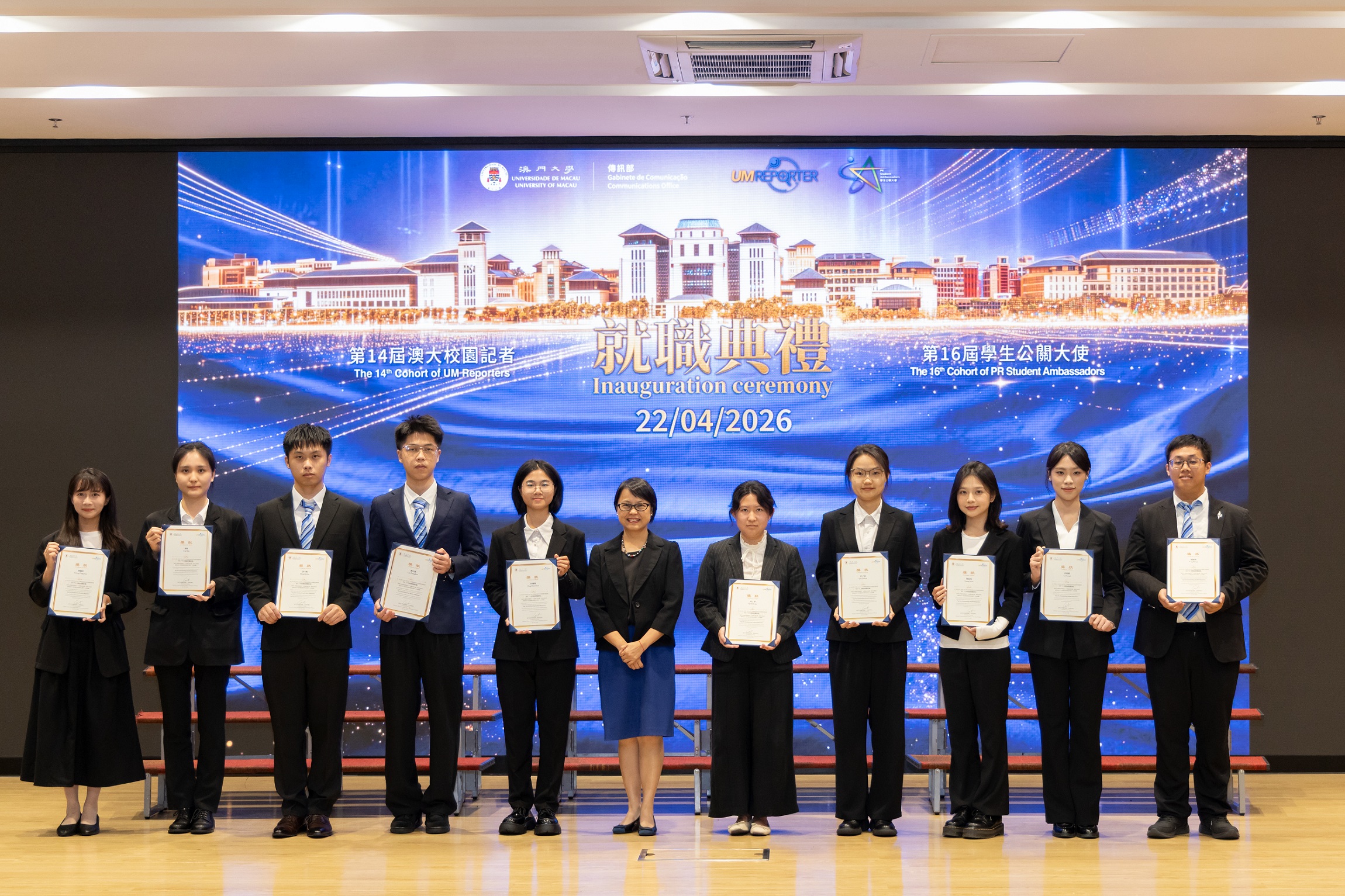 The University of Macau (UM) held an inauguration ceremony for the 14th cohort of UM Reporters and the 16th cohort of PR Student Ambassadors (PRSA) on 22 April. A total of 55 students were inaugurated, while 20 students were awarded certificates in recognition of being among the ‘Top 10 Outstanding UM Reporters’ or the ‘Top 10 Outstanding PR Student Ambassadors’.
