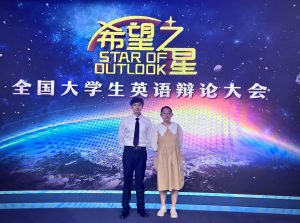 Zhu Shuairong (left) and teammate Wang Hanyu win the championship at a national English debating competition for university students