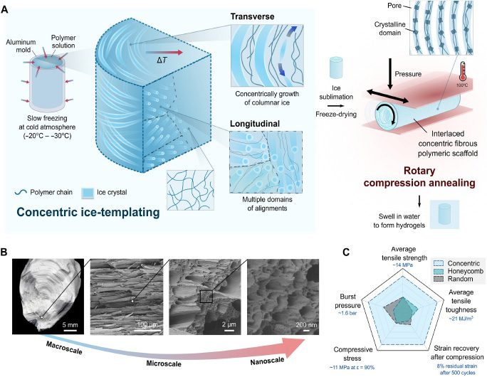 Notably, the manufacturing process of the hydrogel represents a significant leap forward compared to traditional preparation methods that rely on liquid nitrogen and rapid freezing. The core technique, concentric ice-templating, requires no complex equipment; the desired circumferential fibre structure can be stably constructed simply through controlled slow freezing in a standard refrigerator. Prof Lei emphasises that this breakthrough not only enables large-scale production of the hydrogel and dramatically reduces costs, but also lays a solid foundation for future clinical translation and commercial applications.