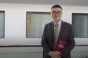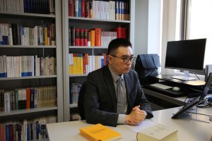 Behind Prof Lyu stands a bookshelf richly lined with legal volumes