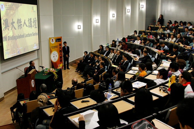 The 19th Lecture of UM’s Distinguished Lecture Series, organized by the University of Macau’s (UM) Student Affairs Section, took place yesterday, on 30 November 2011. The speaker was UM’s University Council Chair Dr. Tse Chi Wai. Dr. Tse shared his experiences about UM Charter revision as well as the meaning of life. The talk attracted a full-house audience.