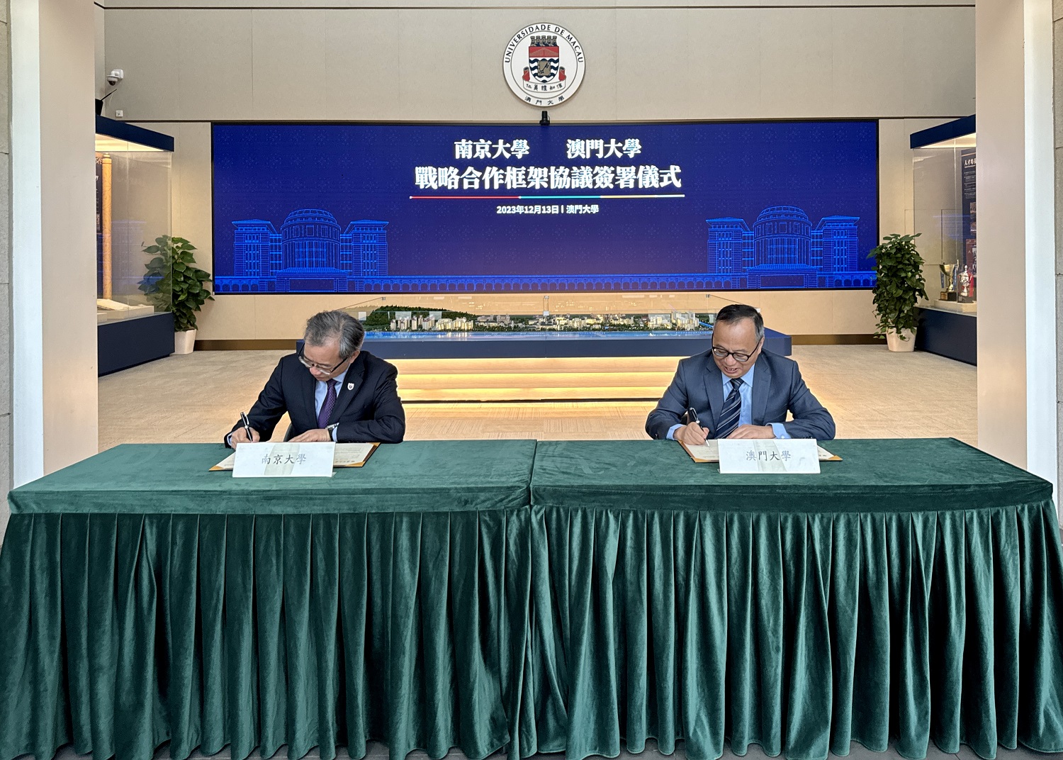 Tan Zhemin, president of Nanjing University (NJU), led a delegation to visit the University of Macau (UM) today (13 December) and was received by Yonghua Song, rector of UM. The two parties signed a strategic cooperation framework agreement with the aim of jointly promoting talent cultivation and research innovation in Jiangsu and Macao, thereby making contributions to the development of higher education in China.