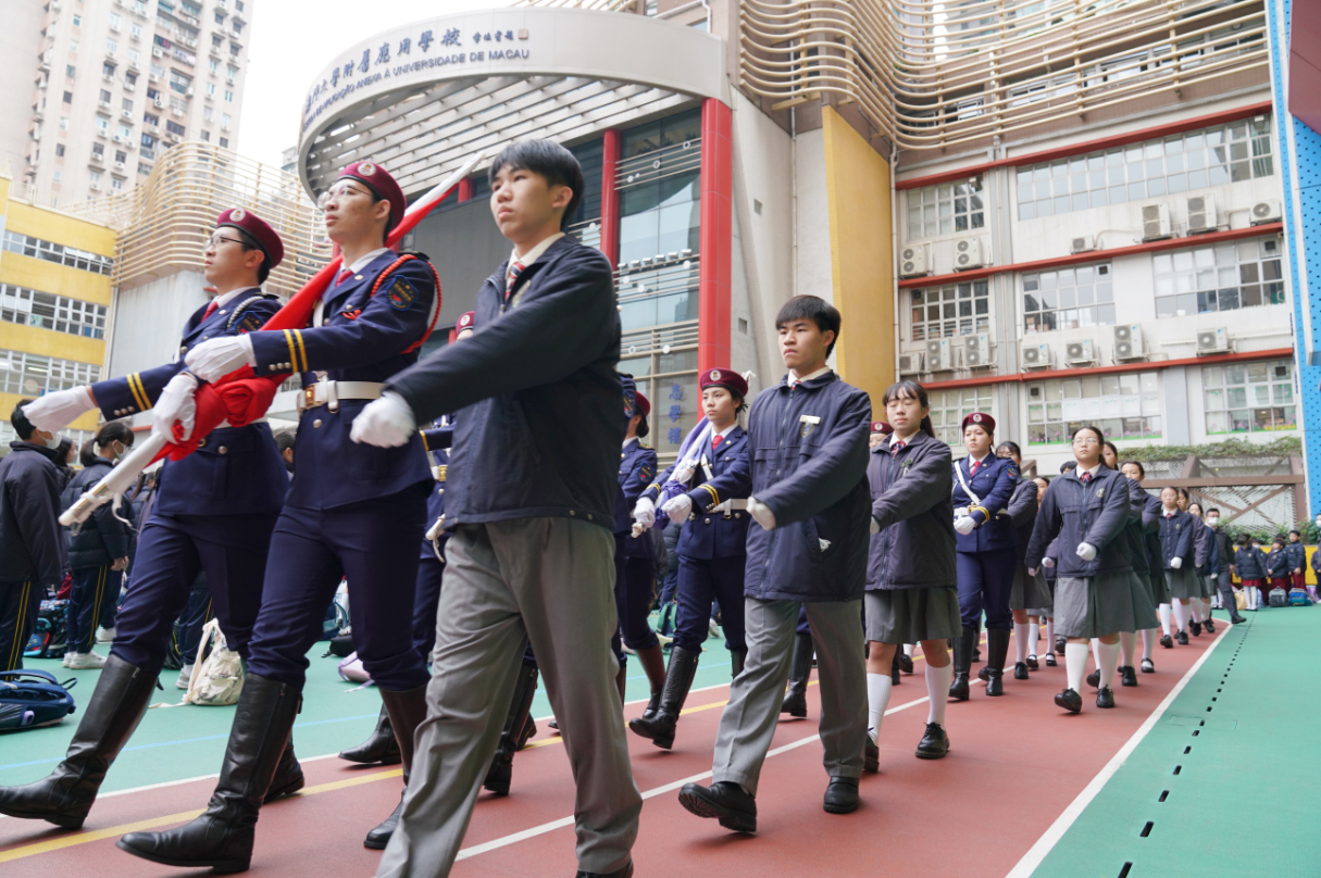 On the occasion of celebrating the 24th anniversary of Macao’s return to the motherland, the National Flag Team of the University of Macau (UM) held an exchange activity at the Affiliated School of the University of Macau (ASUM). Lou Lan Heng, principal of ASUM, together with other teachers and students, participated in the event. Members of the UM National Flag Team and ASUM’s flag-raising team jointly conducted a flag-raising ceremony at the school’s playground. The two parties then held discussions in the school’s auditorium, where the UM National Flag Team promoted knowledge of the national flag and the concept of national security to the students. The team also presented the national flag, ceremonial sword, and other important instruments used for flag raising, and provided instructions to the students on how to properly hold the flag and the sword.