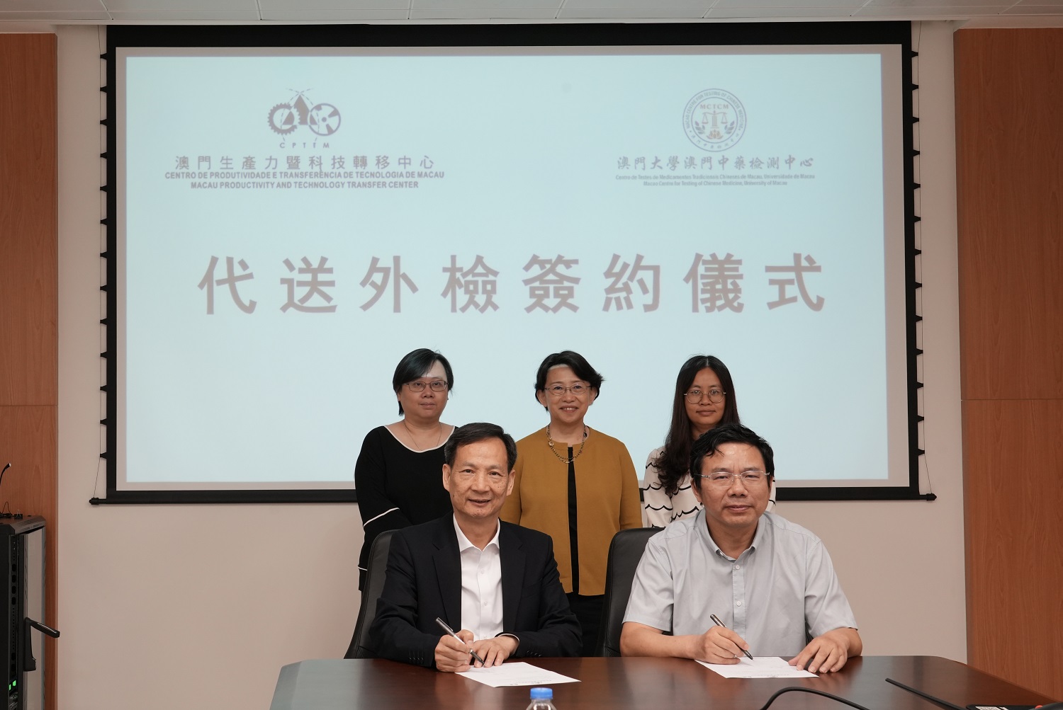 The Macao Centre for Testing of Chinese Medicine, University of Macau (MCTCM, UM), and the Macau Productivity and Technology Transfer Center (CPTTM) signed a memorandum of understanding (MOU) on the delivery service for lab test, with the aim of promoting Macao’s ‘1+4’ strategy for economic diversification and the development of the Chinese medicine industry.