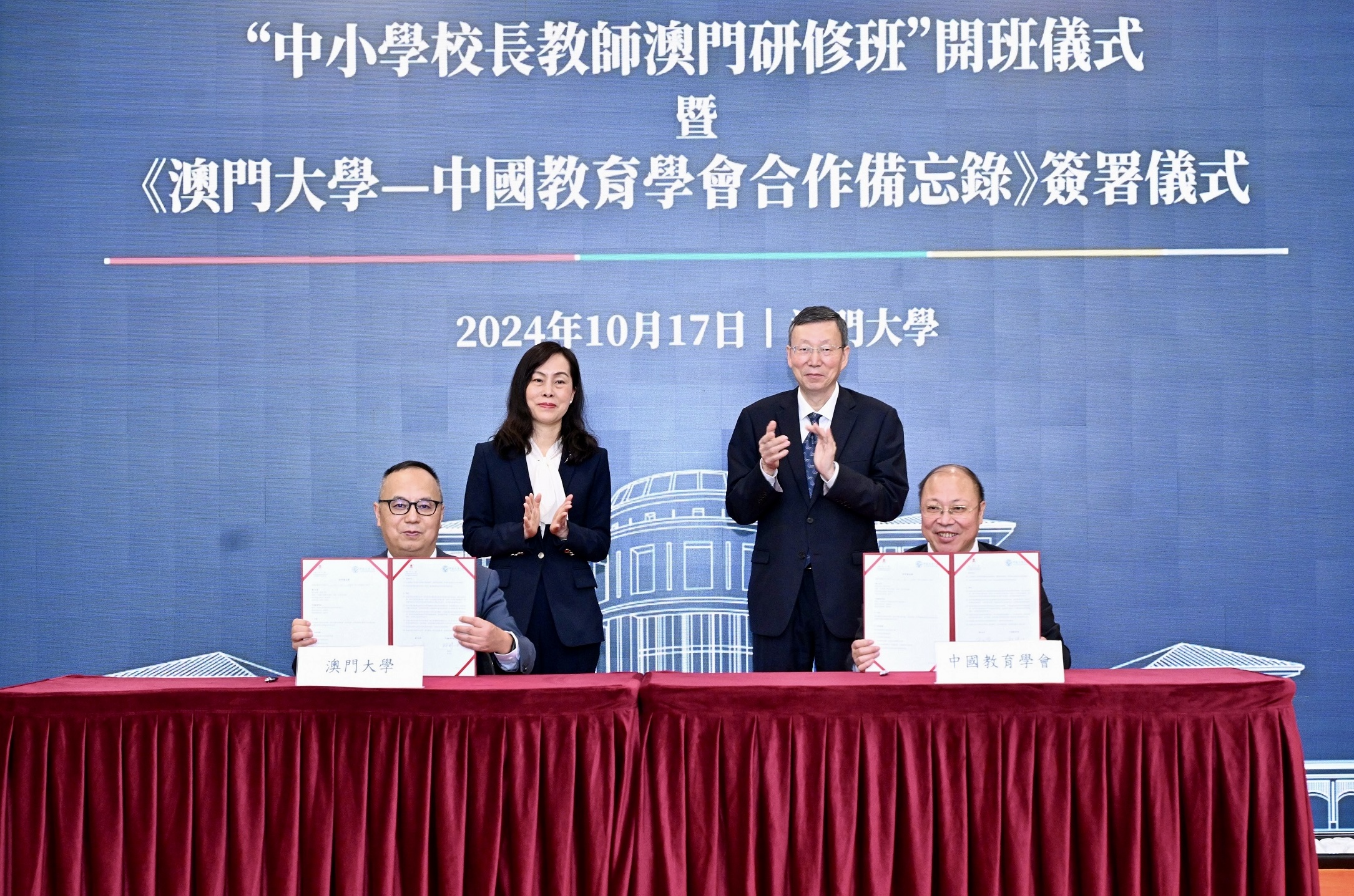 The University of Macau (UM) and the China Society of Education (CSE) have jointly launched a training programme for primary and secondary school principals and teachers in Macao. An opening ceremony for the first cohort of the programme was held today (17 October), along with the signing ceremony of the memorandum of understanding between UM and CSE. Through the training programme and other collaborative initiatives, UM and CSE aim to promote the exchange of school management and teaching experiences between Macao and mainland China, enhance the professional skills and innovation of primary and secondary school principals and teachers, and nurture educators for the new era.