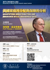 The University of Macau (UM) will hold a UM Doctor honoris causa Lecture on 28 November (Friday). Thomas J. Sargent, recipient of the Doctor of Business Administration honoris causa from UM and the 2011 Nobel laureate in Economic Sciences, will deliver a talk titled ‘Quantifying Redistribution and Insurance in U.S. Household Data’. All are welcome to attend.
