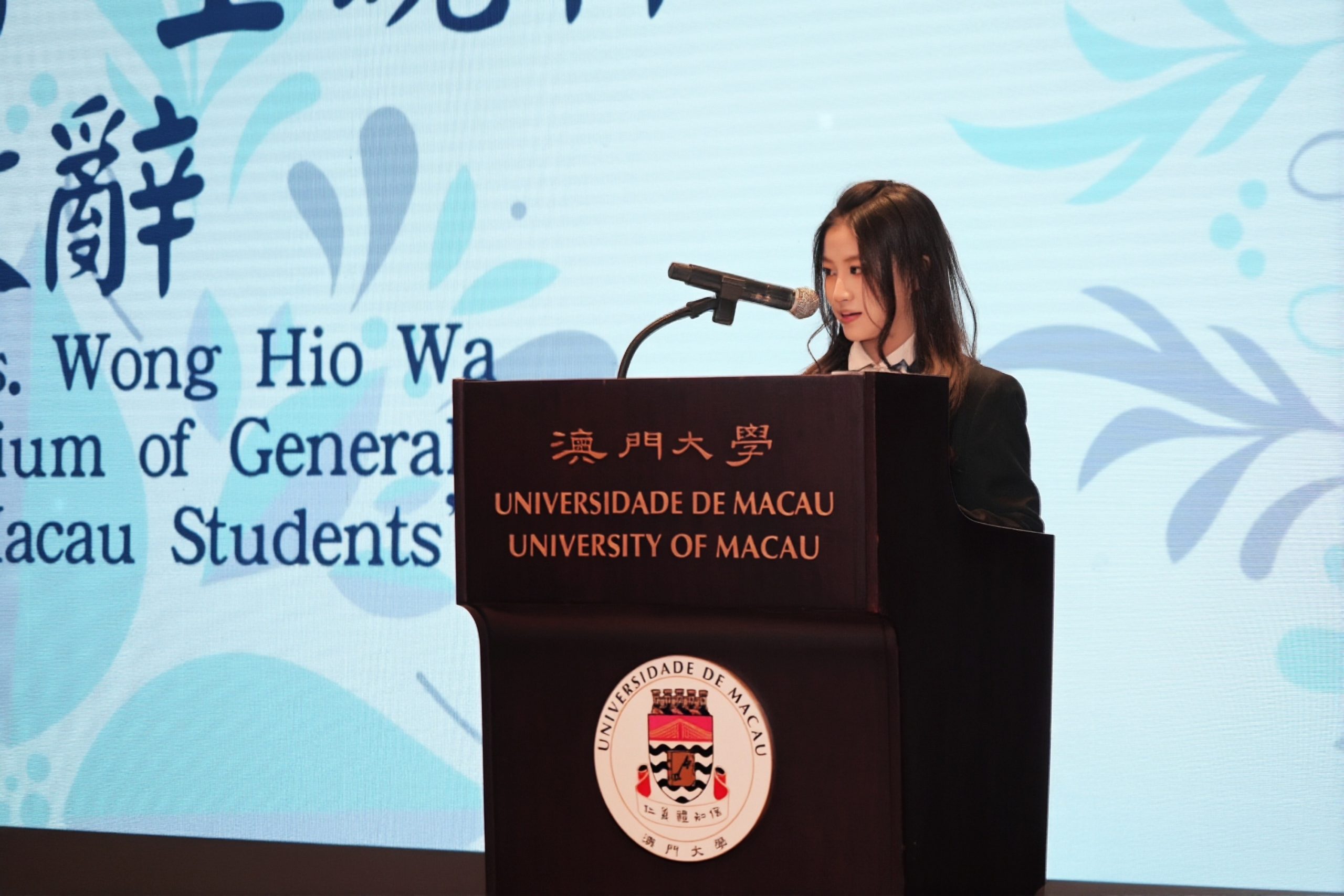 During the ceremony, the new leadership took their oaths in the presence of Chan Iok Wai, head of the Department of Students of the Education and Youth Development Bureau of the Macao SAR government, and Paul Pang, dean of Students at UM. In his speech, Pang recognised the contributions of previous terms of the Students’ Union in serving students and supporting the university’s development. He also encouraged the new leadership and its affiliated organisations to continue creating platforms that help students broaden their international perspectives and apply their talents to contribute to Macao and the country. Wong Hio Wa, President of the Presidium of General Assembly, said that the new leadership will further enhance the union’s service quality and efficiency. She added that it will work closely with affiliated organisations to better address students’ needs, enrich campus culture, and support students’ all-round development.
