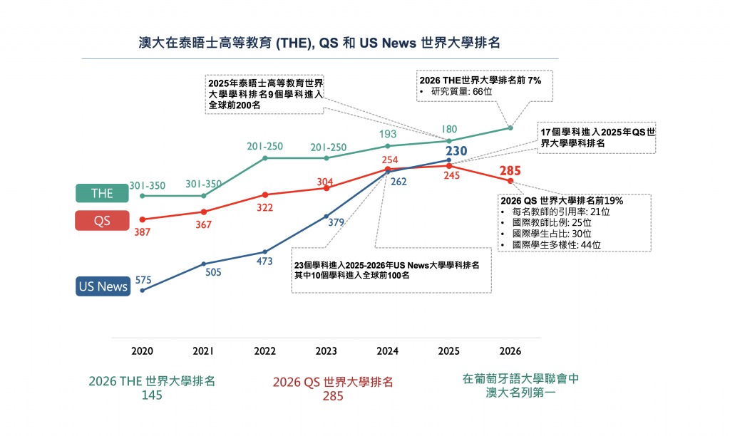 澳門大學在泰晤士高等教育(Times Higher Education,THE)世界大學排名第145位、全球年輕大學排名第14位、亞洲大學排名第34位、在葡萄牙語大學聯會中名列第一。在Quacquarelli Symonds(QS)世界大學排名285位。在《美國新聞與世界報道》(U.S. News & World Report)全球最佳大學排名第230位。共有15學科領域進入基本科學指標資料庫(ESI)前1%之列,包括工程學、材料科學、計算機科學、化學、臨床醫學、藥理學與毒理學、精神病學/心理學、社會科學總論、生物學與生物化學、分子生物與遺傳學、農業科學、經濟學與商學、環境科學與生態學、地球科學學科、數學,其中,工程學、計算機科學、藥理學與毒理學更躋身全球前0.1%頂尖學科。