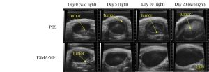 PSMA納米粒子能在光動力治療時摧殘實體腫瘤。我們在一組有膀胱癌的實驗組小鼠身上,注射裝載了YI‐1染料的PSMA納米粒子,然後每5日用808nm鐳射或660nm鐳射進行一次光動力治療,每次30分鐘。兩輪治療後,小鼠的腫瘤明顯縮小,用808nm鐳射進行治療時效果尤其顯著,癌細胞活性下降超過50%。與此同時,沒有使用PSMA納米粒子治療的對照組小鼠的腫瘤不斷增大,到了第20日幾乎佔據整個膀胱。解剖了實驗組小鼠後,發現牠們的心、肝、脾、肺、腎都沒有明顯損傷或炎症,可見裝載了YI‐1染料的PSMA納米粒子沒有產生全身性的毒性,是有效、可靠的光敏劑。