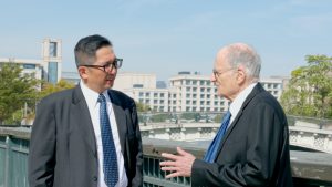 走在中央大道上,薩金特教授身姿挺拔、步履穩健,整齊的舊式西裝勾勒出依然結實的體魄。他一頭銀髮梳得一絲不苟,在午後陽光下閃耀如新雪。此刻,他正與工商管理學院院長余俊教授並肩而行,二人談興甚濃,意猶未盡地延續著午餐時的討論。