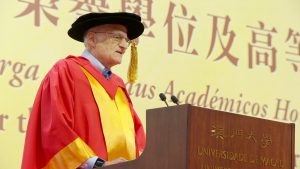 這場隨步履延展的學術對話,或許正是薩金特教授數十年如一日終身學習、自強不息的寫照,對新知的渴望,對思想碰撞的憧憬,從未因年歲增長或榮譽加身而褪色。憑藉在「宏觀經濟中因果關係的實證研究」領域的突破性貢獻,他於2011年榮獲諾貝爾經濟學獎。去年11月,他獲頒澳門大學工商管理榮譽博士學位時發表感言:「我並非以功成名就的學者身份站在這裡,而是作為一個心懷感激、始終在學習的學生。我不斷吸收不同的觀點,始終視自己為學生而非教師。」一番謙遜而真摯的言語,令台下師生動容。