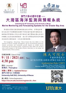 澳門大學將於11月9日(星期二)舉辦“澳門大學40週年校慶——大學講壇”講座,由中國科學院院士陳大可就“大灣區海洋監測與預報系統”為題發表演說,探討大灣區海洋監測與預報系統的前沿發展,以及未來發展重點。
