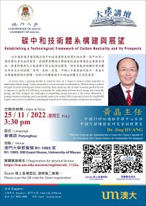 澳門大學將於11月25日(星期五)舉辦“大學講壇”講座,由中國21世紀議程管理中心主任、中國可持續發展研究會副理事長黃晶擔任講者,就“碳中和技術體系構建與展望”為題發表演說,探討國家為達至碳中和所作的努力,以及如何構建相關的技術體系。講座以線上及線下形式舉行,歡迎有興趣人士參加。