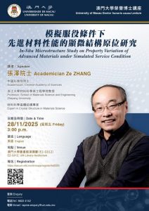 澳門大學將於11月28日(星期五)舉辦“澳門大學榮譽博士講座”,由澳大榮譽理學博士張澤就“模擬服役條件下先進材料性能的顯微結構原位研究”為題發表演說。歡迎有興趣人士參加。
