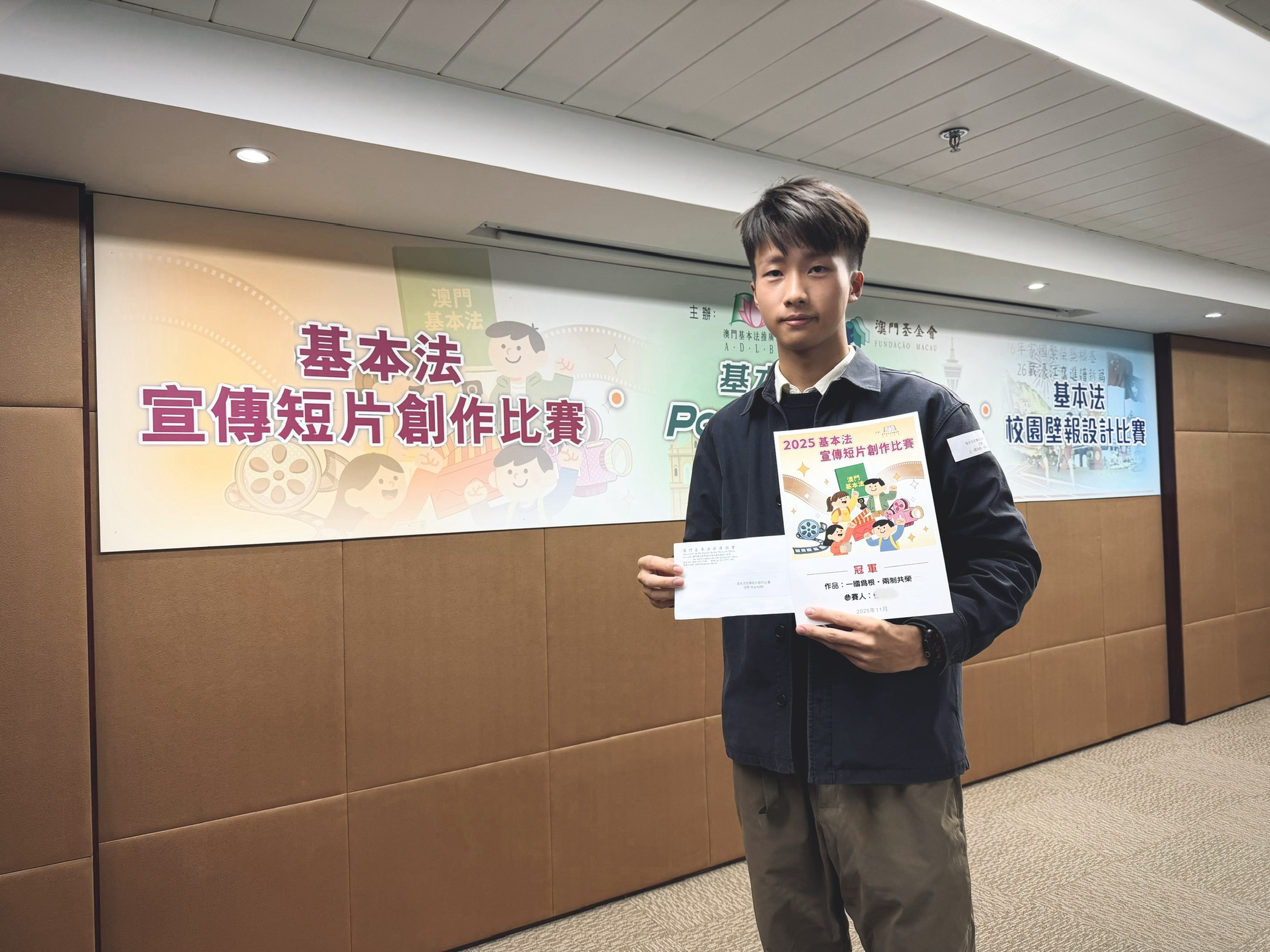澳門大學社會科學學院傳播系學生伍珈毅於“2025基本法宣傳短片創作比賽”中奪得冠軍,其短片作品《一國為根.兩制共榮》以影像語言呈現《中華人民共和國憲法》、《澳門特別行政區基本法》及《維護國家安全法》的核心精神,展現澳門在“一國兩制”護航下持續繁榮穩定的深層力量。