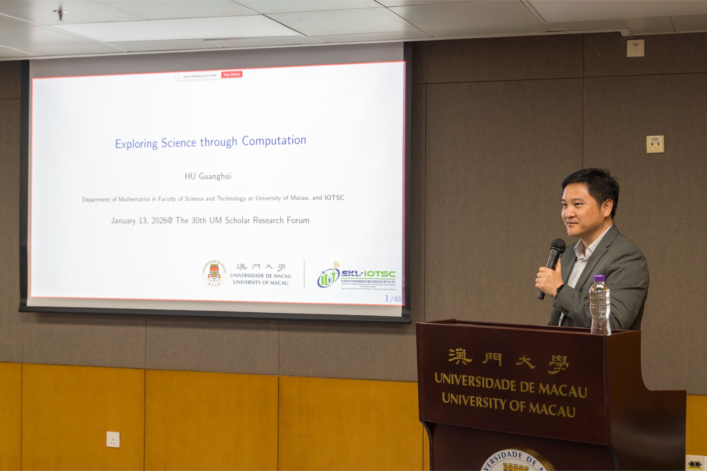 澳門大學今(13)日舉行“澳大學人研究講壇”第30講,由澳大科技學院數學系教授胡光輝圍繞“用計算探索科學”發表演說。講座深入探討計算科學作為繼理論與實驗之後的科研“第三範式”,如何深刻重塑現代研究格局。