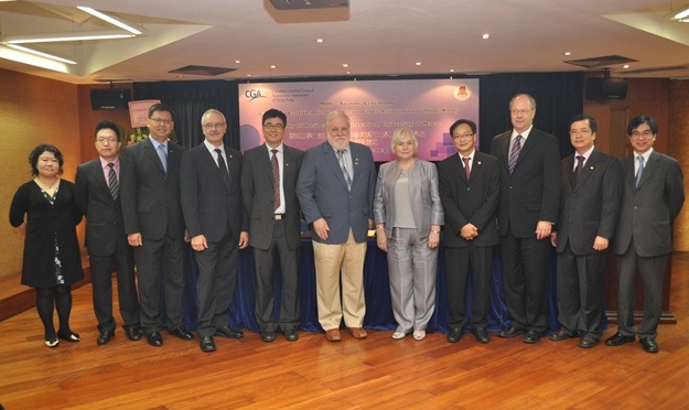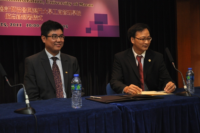 澳大工商管理學院會計及資訊管理學系系主任袁振業教授與香港加拿大註冊會計師主席陳世雄代表簽署。澳大工商管理學院副院長禮米高教授、加拿大註冊會計師協會主席Joyce Evans、澳門註冊會計師公會會員大會主席余漢釗、理事長陸丹青及一眾師生出席見證。
