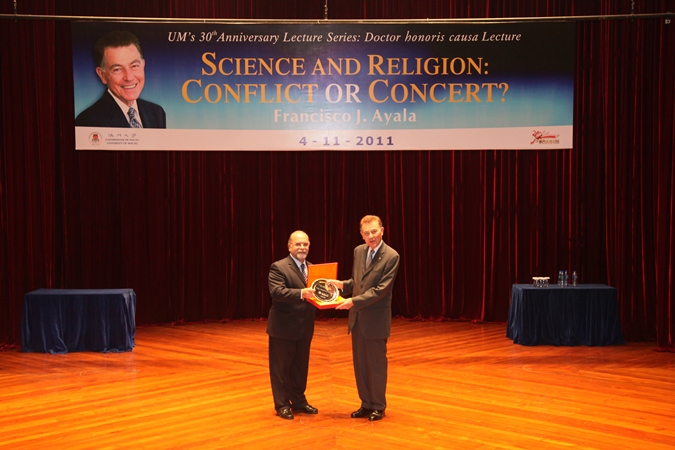 澳門大學今日(四日)舉辦澳大校慶系列講座:榮譽博士講座,進化遺傳學家和分子生物學家弗朗西斯科•若瑟•阿亞拉教授就“科學與宗教:勢不兩立還是和諧共存?”闡述了其精闢的見解。澳大師生、澳大校董會及議庭成員、大學領導層、政府官員、獎學金贊助機構代表、本澳高等院校及中學代表、社團代表等出席,座無虛席。