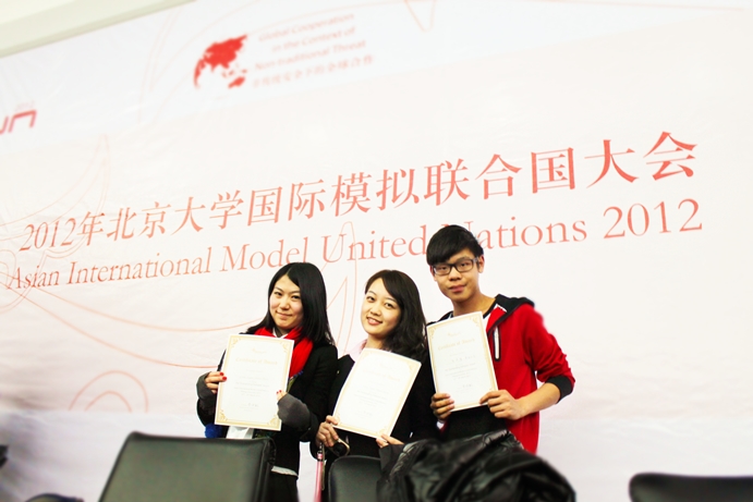 “2012年北京大學亞洲國際模擬聯合國大會”(Asian International Model United Nations,AIMUN)在北京大學舉行,有四百多名來自世界各地二十多個國家和地區的學生參與。澳門大學社會科學及人文學院張沁園、法學院梁銣倩及工商管理學院徐洋磬分別在英文會場及中文會場獲得傑出代表獎(Outstanding Delegate,即個人一等獎)。