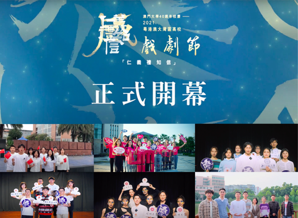 開幕式上,7間灣區高校的一眾學子相繼為澳大40週年校慶送上祝福,增添灣區青年風采。隨後戲劇節正式於線上首演,並展示以澳大校訓“仁、義、禮、知、信”為主題的6個原創劇目,分別是:澳門大學學生會戲劇社《苦盡甘來》、 廣東外語外貿大學戲劇隊《譯勝疫》、深圳大學藝術團戲劇分團(一物戲劇團)《不容辭》、南方科技大學季風戲劇社《被俘的觀眾》、北京師範大學珠海園區話劇團《師者》、五邑大學話劇團《木棉花開》。近百灣區學子發揮戲劇才華創意,以新時代的青年視角詮釋中華智慧、弘揚中華傳統價值,共同推動灣區高校的多元文化發展。