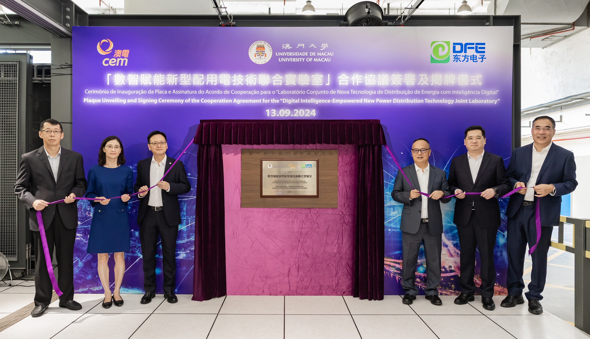 澳門大學與澳門電力股份有限公司及東方電子股份有限公司今(13)日舉行“數智賦能新型配用電技術聯合實驗室”簽署合作協議及揭牌儀式。聯合實驗室將進一步促進澳門電力系統配用電技術的交流及應用實踐,帶動澳門電力行業升級轉型,助力澳門建設智慧城市,並配合國家實現“雙碳”目標。