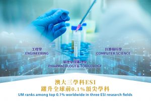 頂尖學術指標基本科學指標(Essential Science Indicators,ESI)最新統計數據顯示,澳門大學工程學、計算機科學、藥理學與毒理學三個學科領域從ESI學科全球排名前1%躍升至前0.1%(千分之一),進入世界頂尖學科的前列。