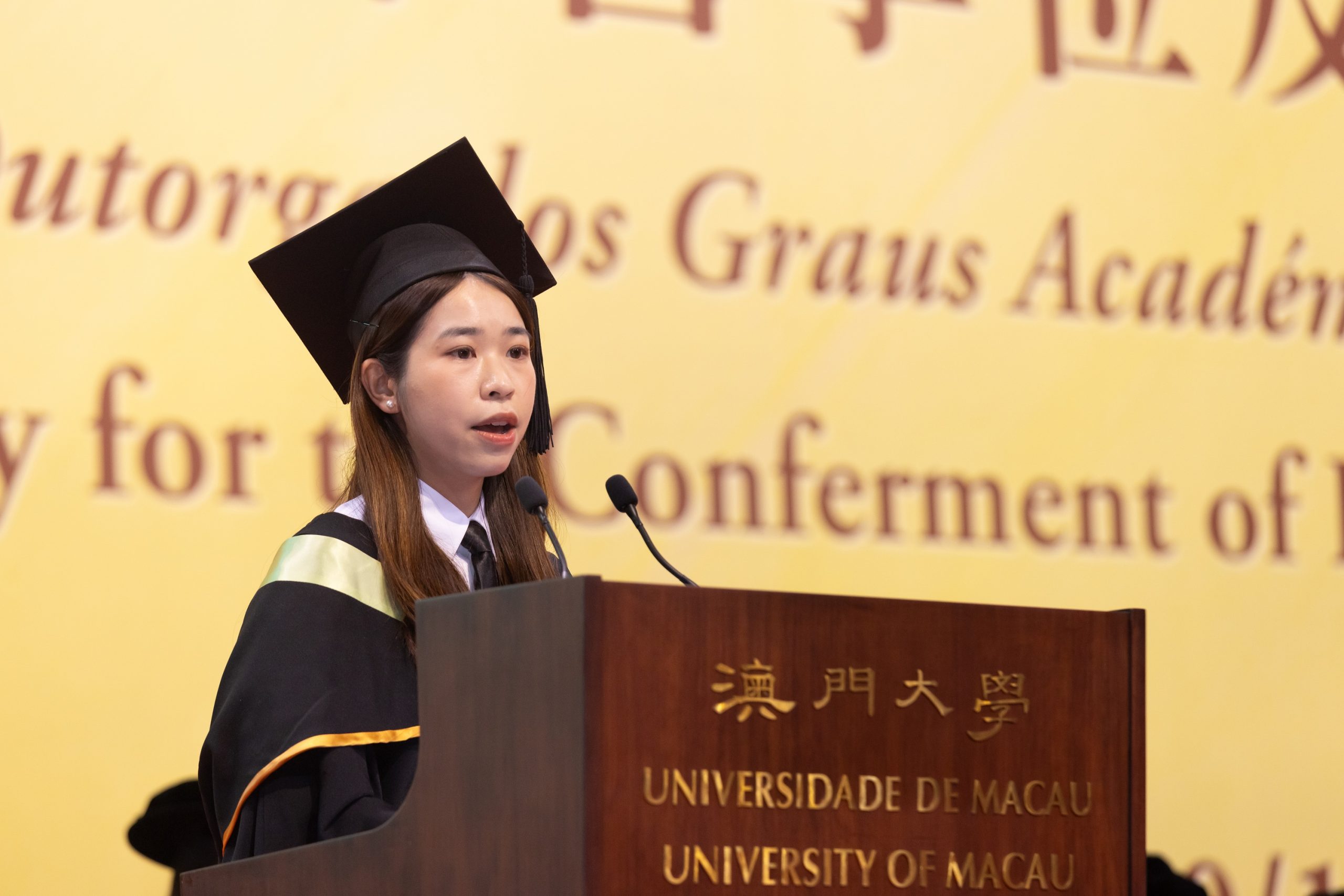 畢業生代表李佩恩表示,就讀澳大,收穫的不僅僅是知識,更磨礪出韌性和同理心,鍛鍊出敢於突破邊界追逐夢想的勇氣。這些收穫將指引畢業生踏入這個複雜且瞬息萬變的世界。帶著澳大賦予的堅實基礎,畢業生不僅做好了適應變化的準備,更準備好引領變革。她還與畢業生共勉:懷揣勇氣、感恩和終身學習的決心出發,運用所學知識,創造有意義的改變。