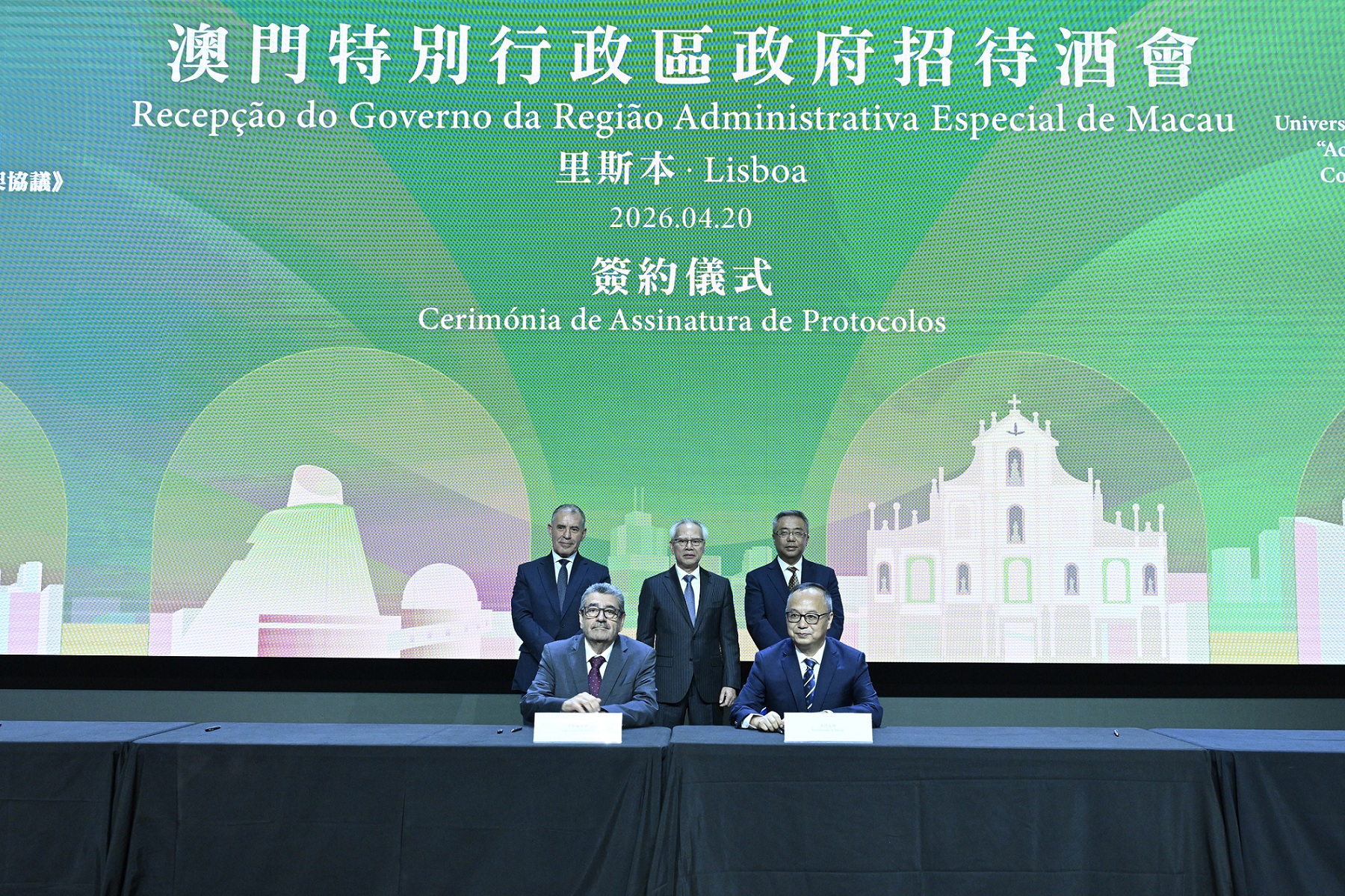 澳門大學校長宋永華與副校長馬許願(Rui Martins)於4月18日至4月21日隨澳門特別行政區行政長官岑浩輝等訪問葡萄牙里斯本。在岑浩輝的見證下,澳大與多所葡萄牙高校簽署合作協議並落實多項重要合作,全面深化聯合課程、科研創新及人才培養三大戰略合作,推動國際高等教育發展和合作。